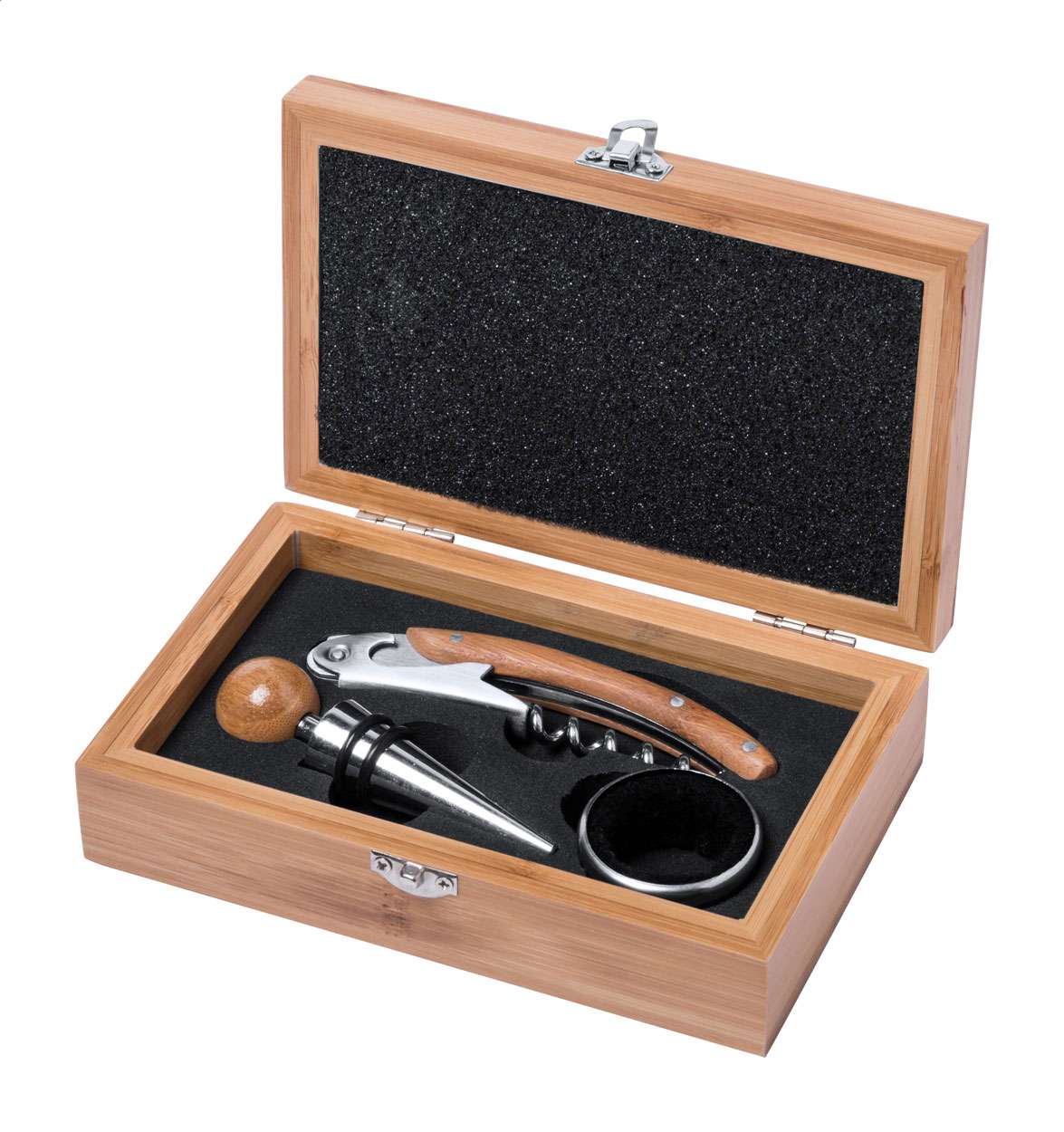 Set vino con tappo, cavatappi e salva goccia in scatola di bambù.