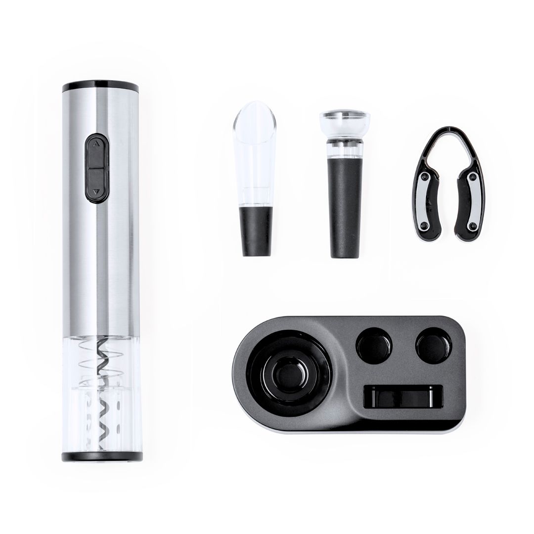 Pratico set da vino con 4 accessori. Contiene un cavatappi elettrico alimentato da 4 batterie AAA (non incluse), un decanter, un tappo per bottiglie e un taglia capsule, con meccanismo a scatto. Include un elegante supporto nero per tenere in ordine gli accessori. Presentato in una scatola kraft di design.