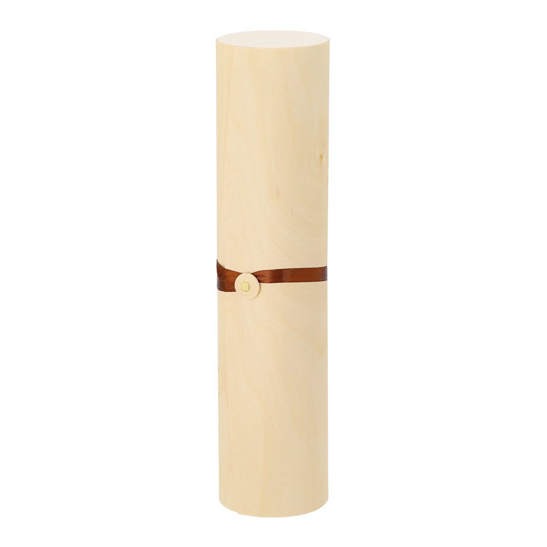 Elegante scatola di presentazione in legno. Forma cilindrica con coperchio in legno flessibile e chiusura in corda di similpelle. Presentato in una scatola di design kraft.