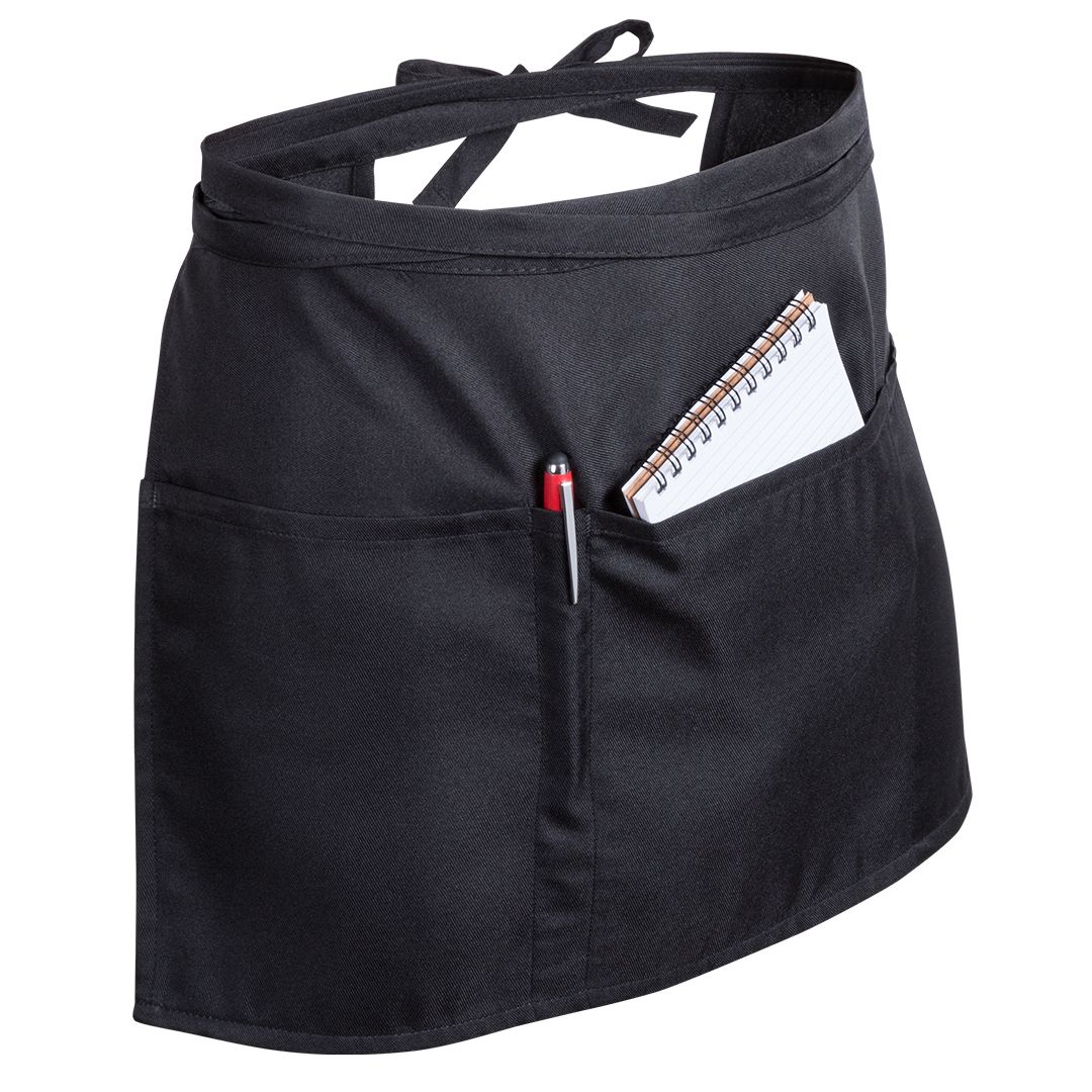 Grembiule in vita in materiale 100% poliestere con finitura morbida in un elegante colore nero. Con 2 tasche grandi, tasca media e tasca portapenne. Regolabile con cinghie.