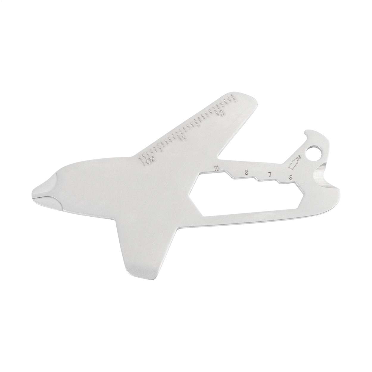 Portachiavi multiuso in acciaio riciclato a forma di aeroplano con apribottiglie, righello, cacciaviti a croce e piatti, chiavi esagonali e tagliafili.