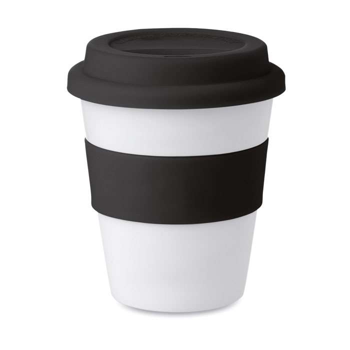 Bicchiere da bibita in PP bianco lucido a strato singolo, con coperchio e anello intermedio in silicone. Capacità 350ml. Disponendo di un solo strato potrebbe scaldarsi anche esternamente.