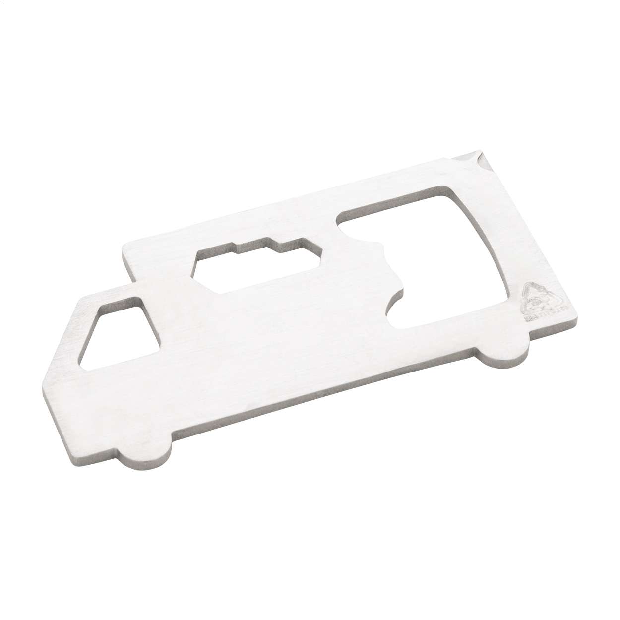 Multi utensile in acciaio inox riciclato a forma di camion con apribottiglie, cacciavite a croce e 3 chiavi piatte.