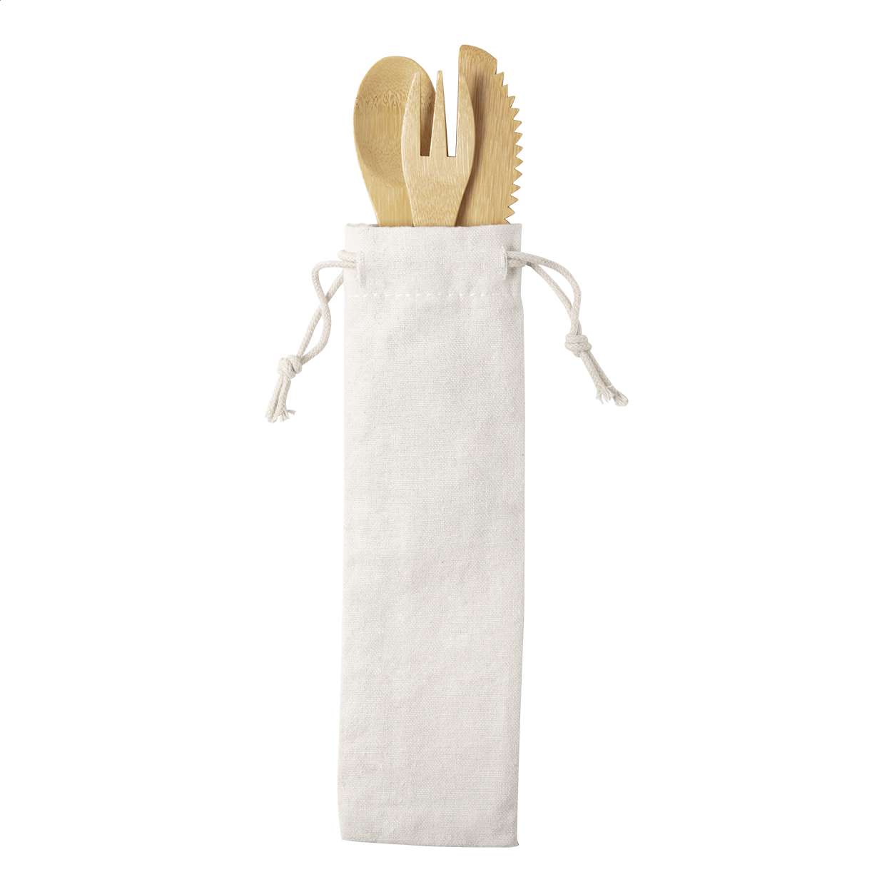 Set 3 pz di posate in bambù in sacchetto di cotone.
