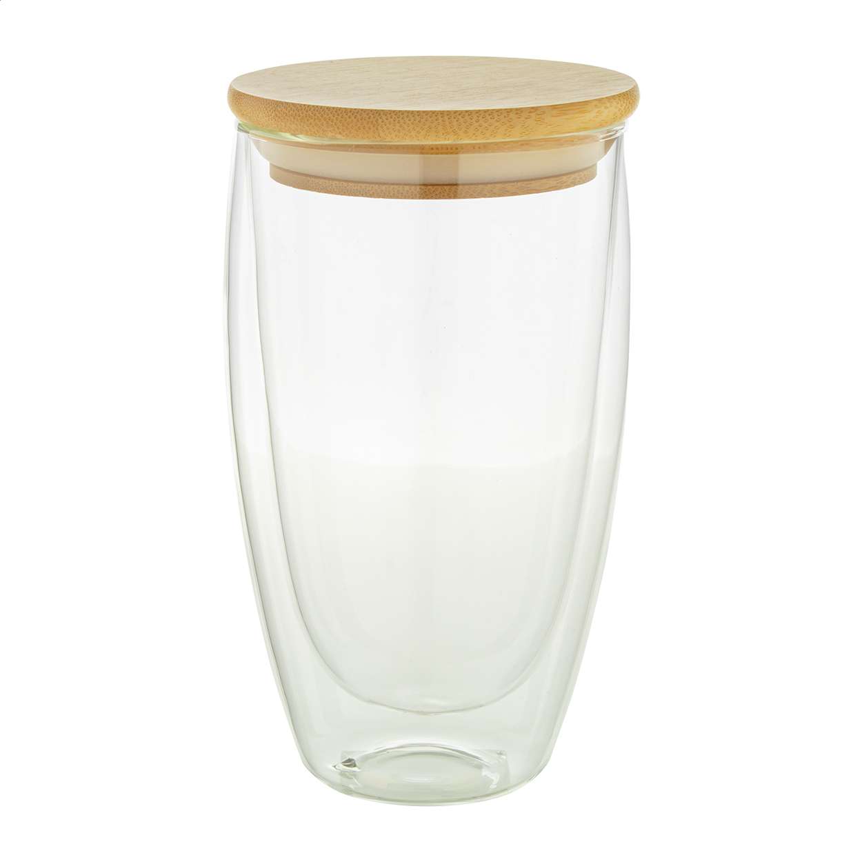 Bicchiere termico da 420 ml. in vetro borosilicato a doppia parete, con coperchio in bambù e scatola in cartoncino kraft.