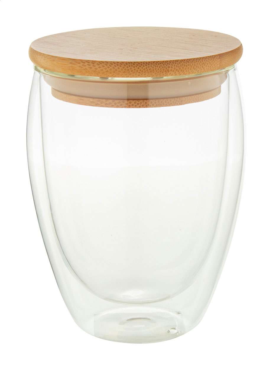 Tazza termica da 320 ml. in vetro borosilicato a doppia parete, con coperchio in bambù e scatola in cartoncino kraft.