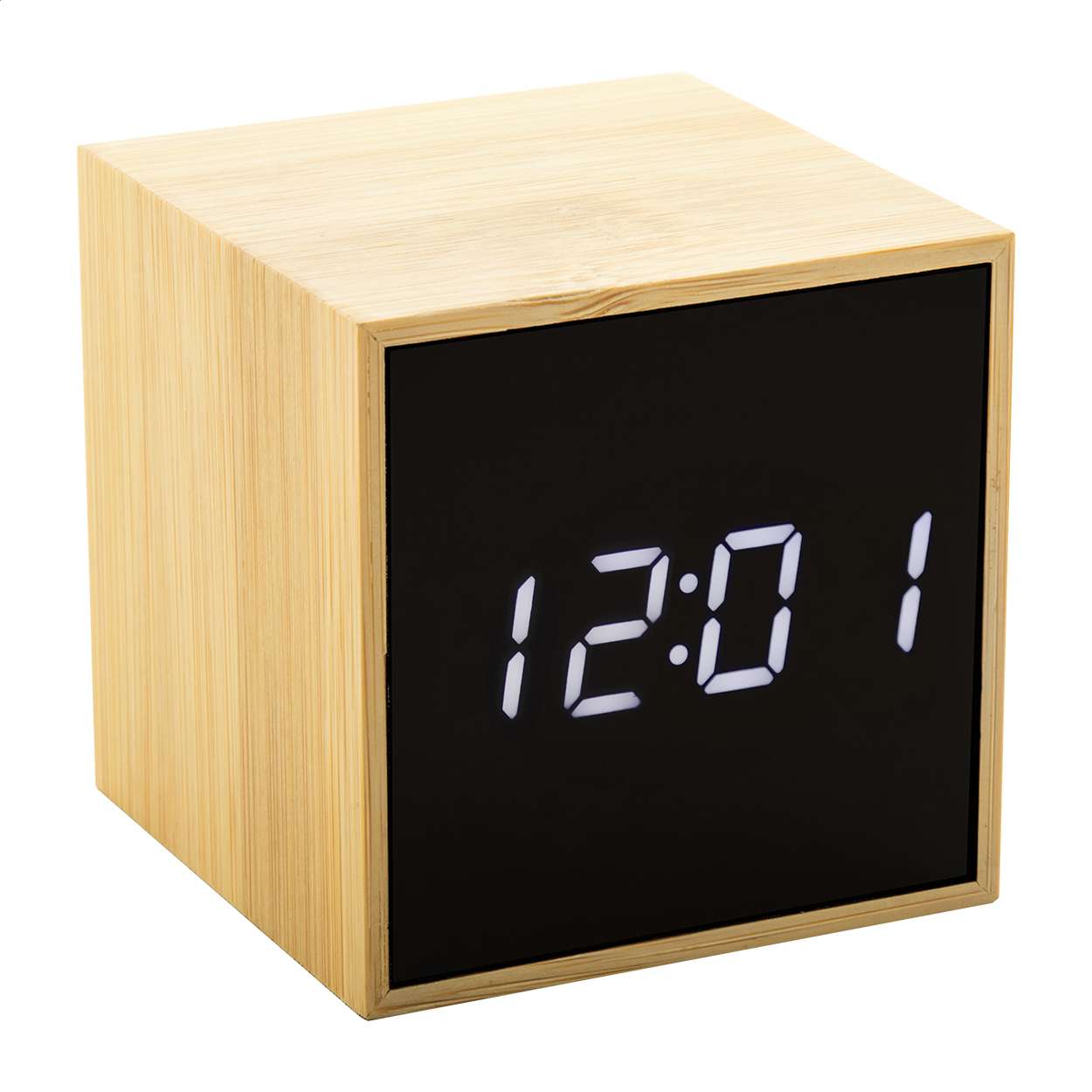 Sveglia digitale e termometro con display a LED bianchi, rivestita in bambù. Può essere alimentata tramite il cavo di ricarica USB incluso, o con 3 batterie AAA (senza batteria).