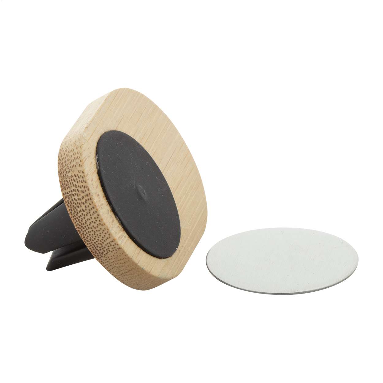 Porta cellulare per auto magnetico in bambù con montaggio su bocchetta d'aria e piastra di metallo biadesiva inclusa. Confezione in scatola di cartoncino kraft