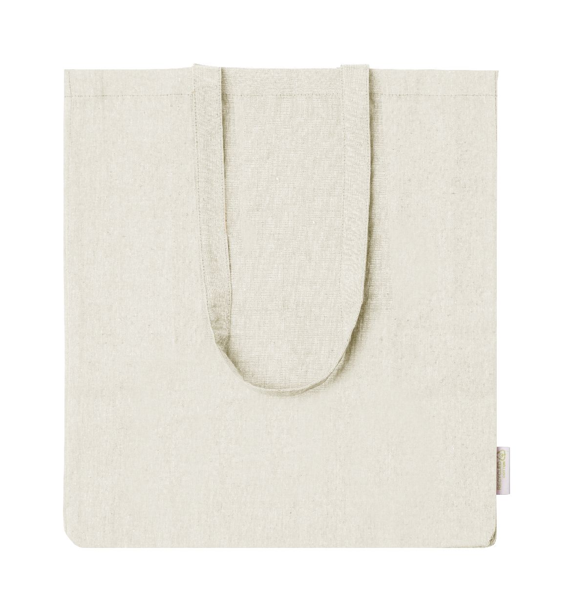 Borsa per la spesa in 100% cotone riciclato, 140 g/m². con soffietto, manici lunghi ed etichetta cotone riciclato.