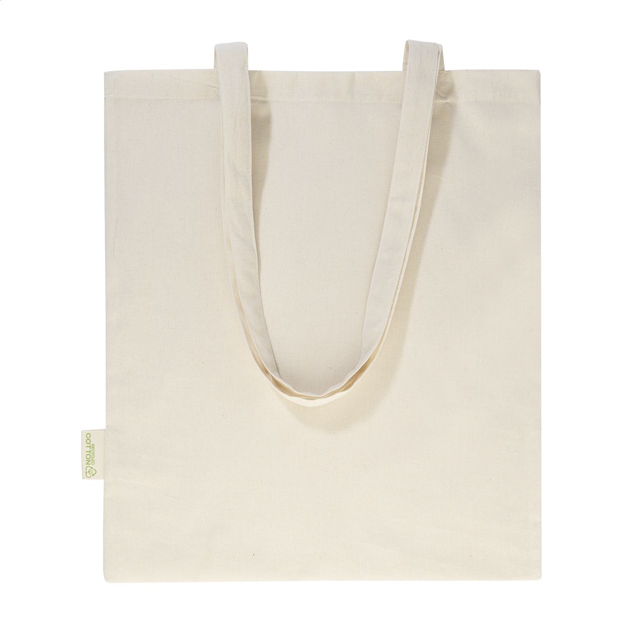 Shopper con manici lunghi in 70% cotone riciclato e 30% poliestere RPET da 140 g/m² ed etichetta cotone riciclato.