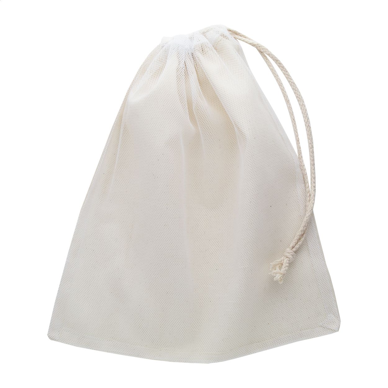 Sacchetto riutilizzabile in cotone con fronte in rete di poliestere e chiusura con coulisse, 95 g/m².