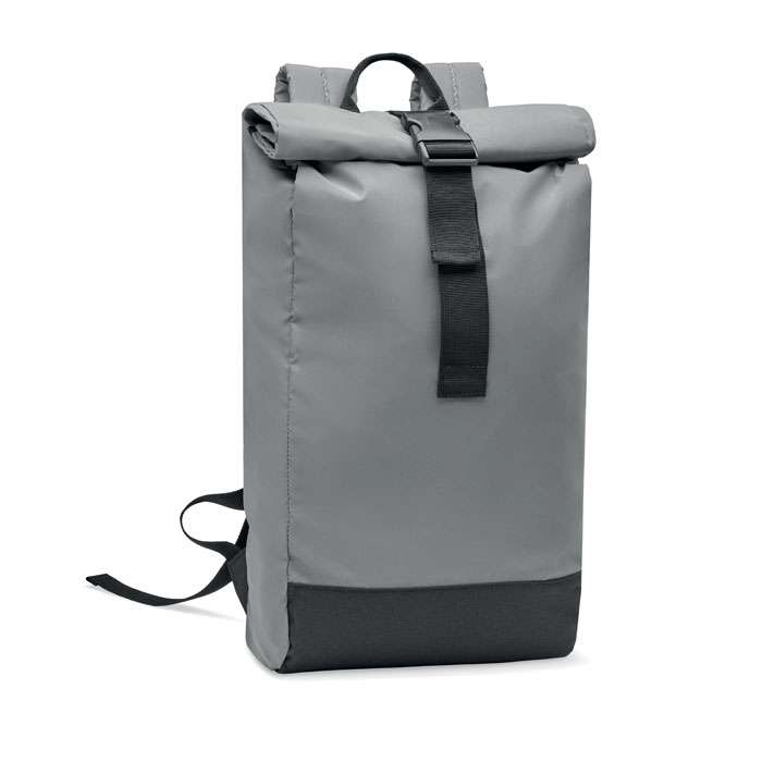 Zaino rolltop in poliestere 190T altamente riflettente, porta laptop. Lato interno con chiusura a gancio e anello. Schienale, spallacci e fondo imbottiti. Tasca frontale con cerniera.