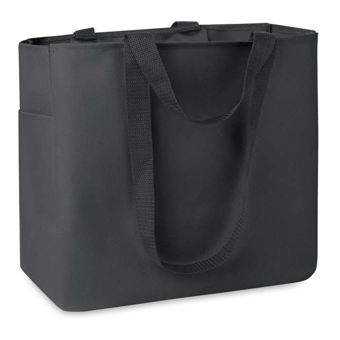 Shopper in poliestere 600D con tasca laterale e tasca interna con chiusura a zip. Manici lunghi e corti.