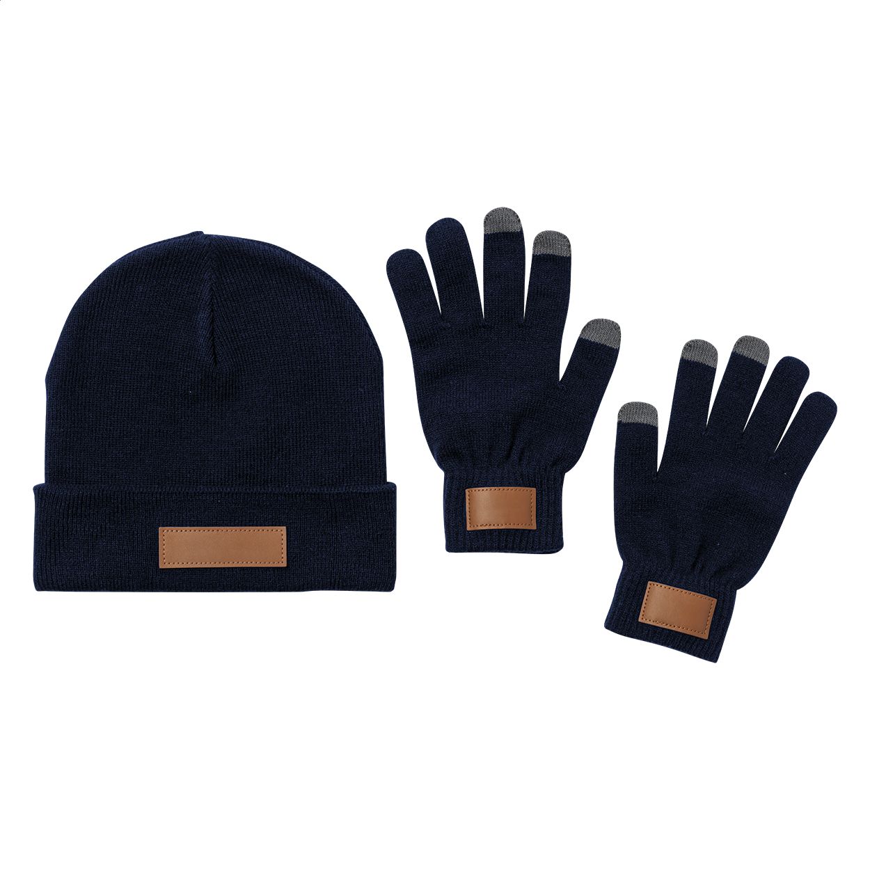 Set invernale da 3 pezzi. Include berretto in RPET, sciarpa e guanti tattili con etichetta per la zona di stampa.