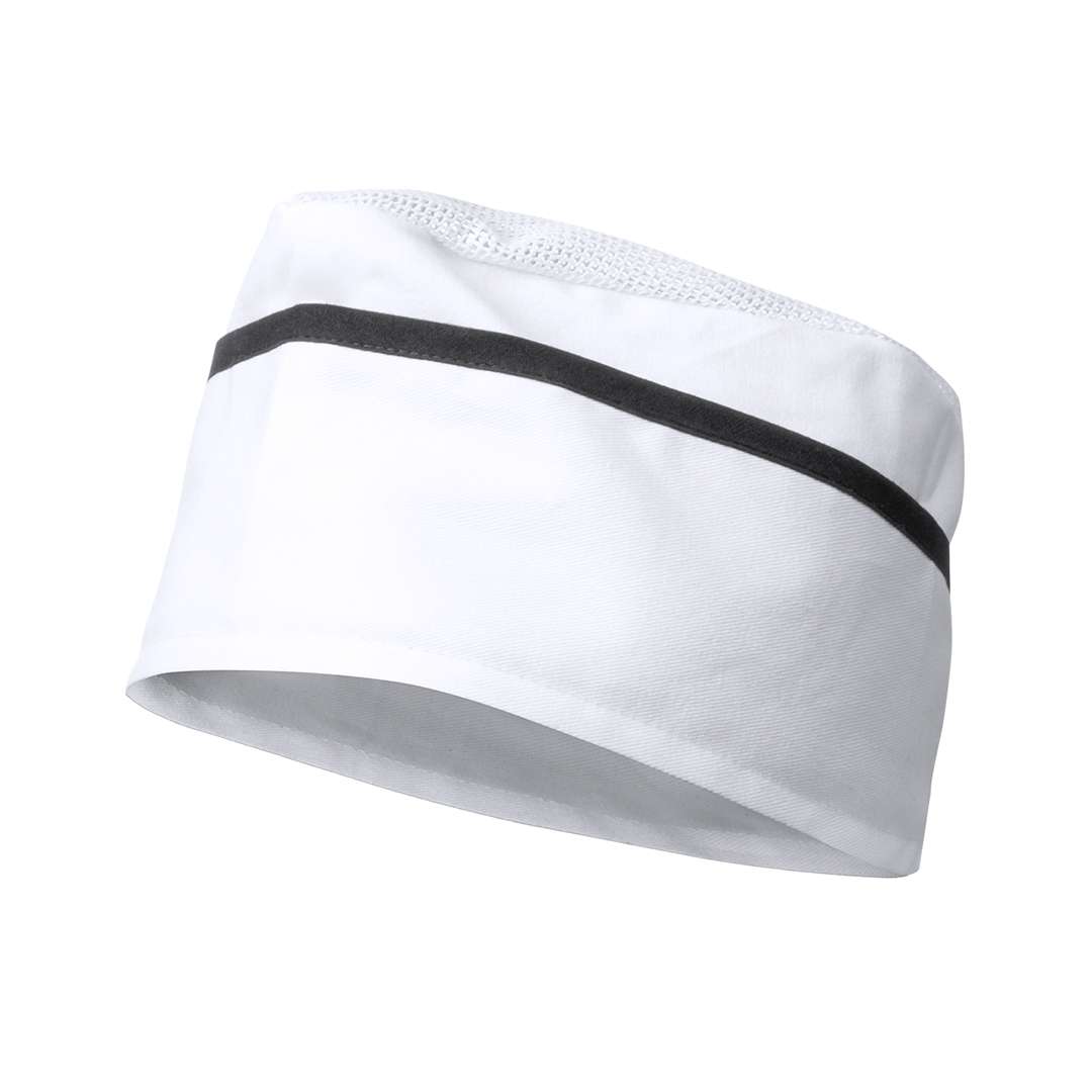 Cappello da cucina in comodo materiale TC - una combinazione di cotone e poliestere - in un'allegra combinazione di colori e base bianca con dettagli dai colori vivaci.