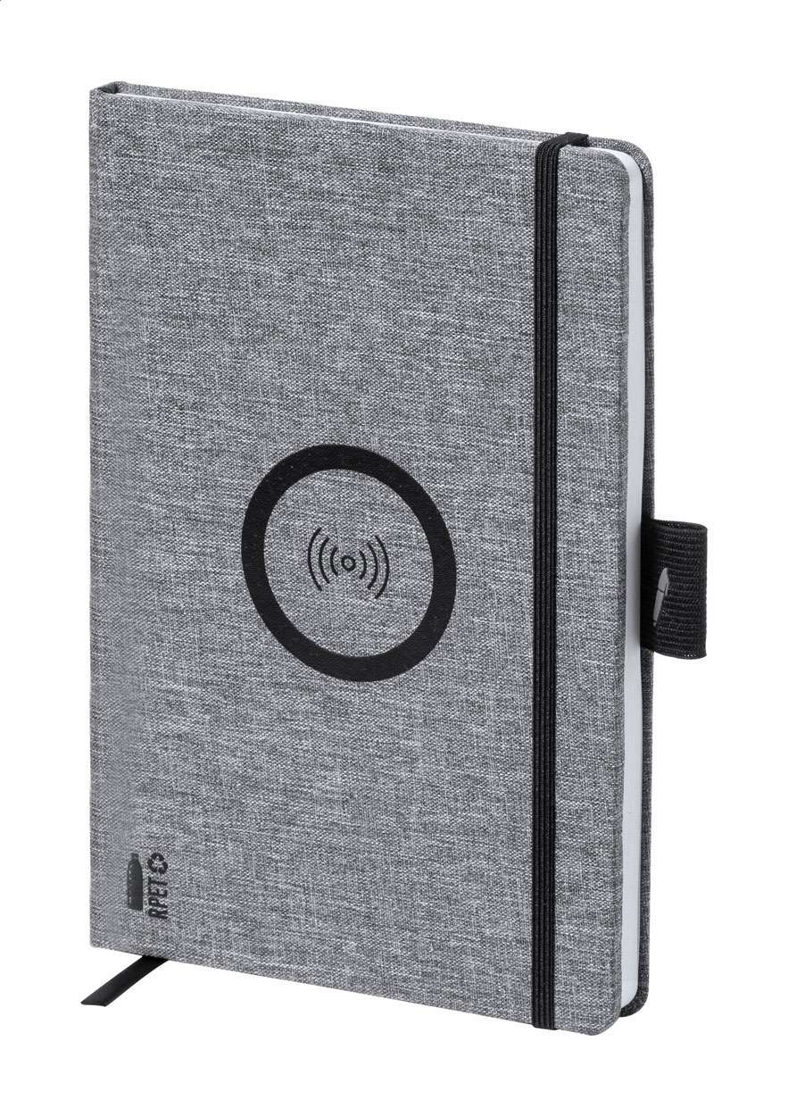 Quaderno con copertina in poliestere RPET, caricatore veloce wireless incorporato (10W) e 80 fogli a righe. Formato A5. Incluso cavo di ricarica USB. Poliestere 300D RPET.