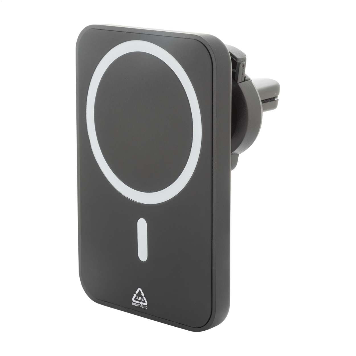 Supporto magnetico per auto in ABS riciclato con caricatore rapido wireless incorporato (15W) e supporto regolabile per il montaggio sulla bocchetta dell'aria. Include un anello metallico autoadesivo che consente l'utilizzo della funzione magnetica su qualsiasi dispositivo ricaricabile in modalità wireless. Compatibile con iPhone® 12 o più recente. Cavo di ricarica USB incluso.