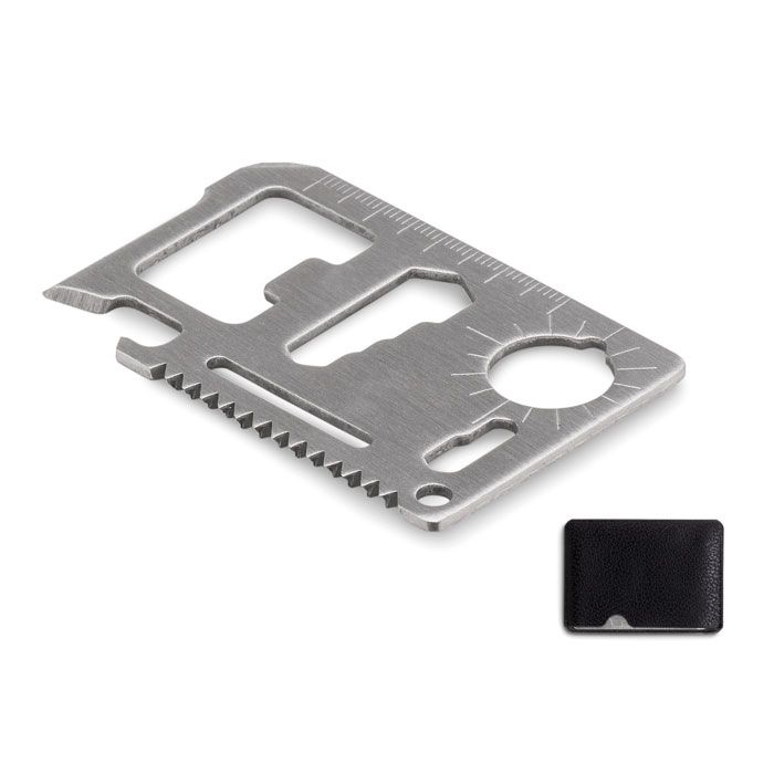 Scheda multi-tool tascabile in acciaio inossidabile. 8 funzioni: seghetto, tagliafili, chiave inglese, cacciavite Phillips, cacciavite a taglio, metro, apribottiglie e portachiavi.