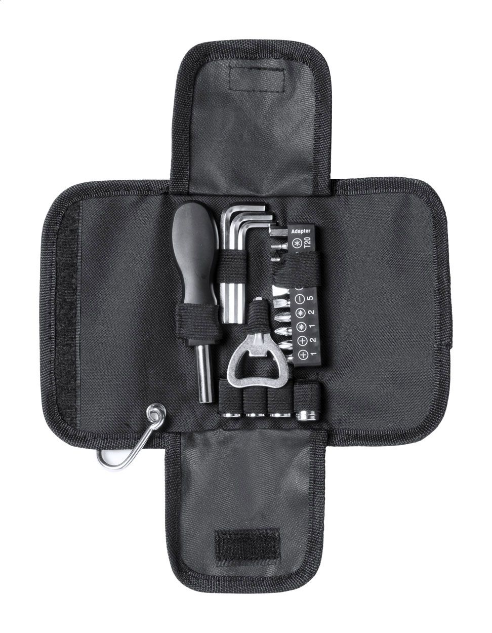 Set 19 attrezzi con custodia di poliestere e moschettone.