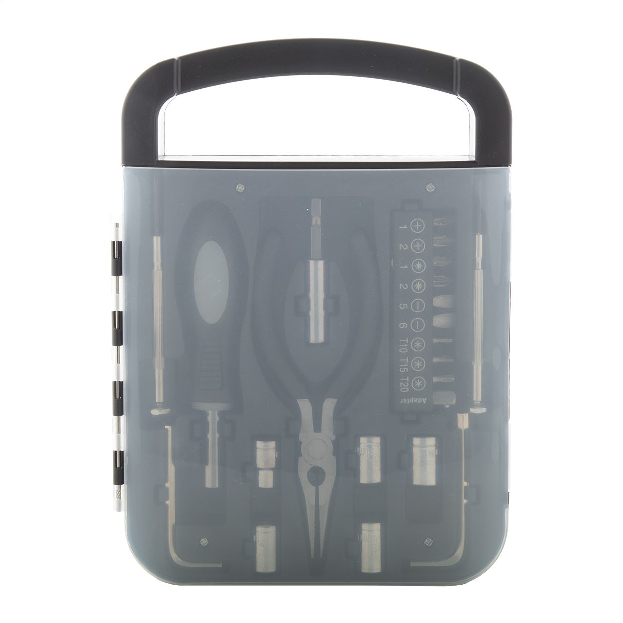 Set 22 pz attrezzi in metallo e valigetta in plastica con: 2 cacciavite, 1 pinza, 1 manico, 2 dadi esagonali, 5 chiavi a bussola, 10 punte.
