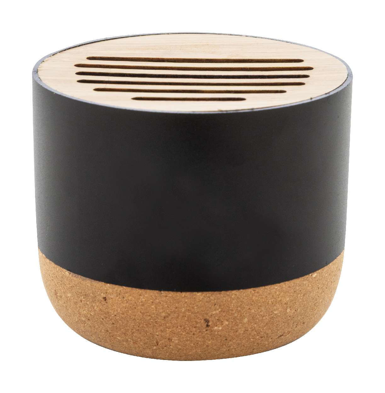 Cassa wireless in alluminio riciclato con copertura in bambù, base in sughero naturale e batteria ricaricabile (400 mAh). Cavo di ricarica USB incluso.