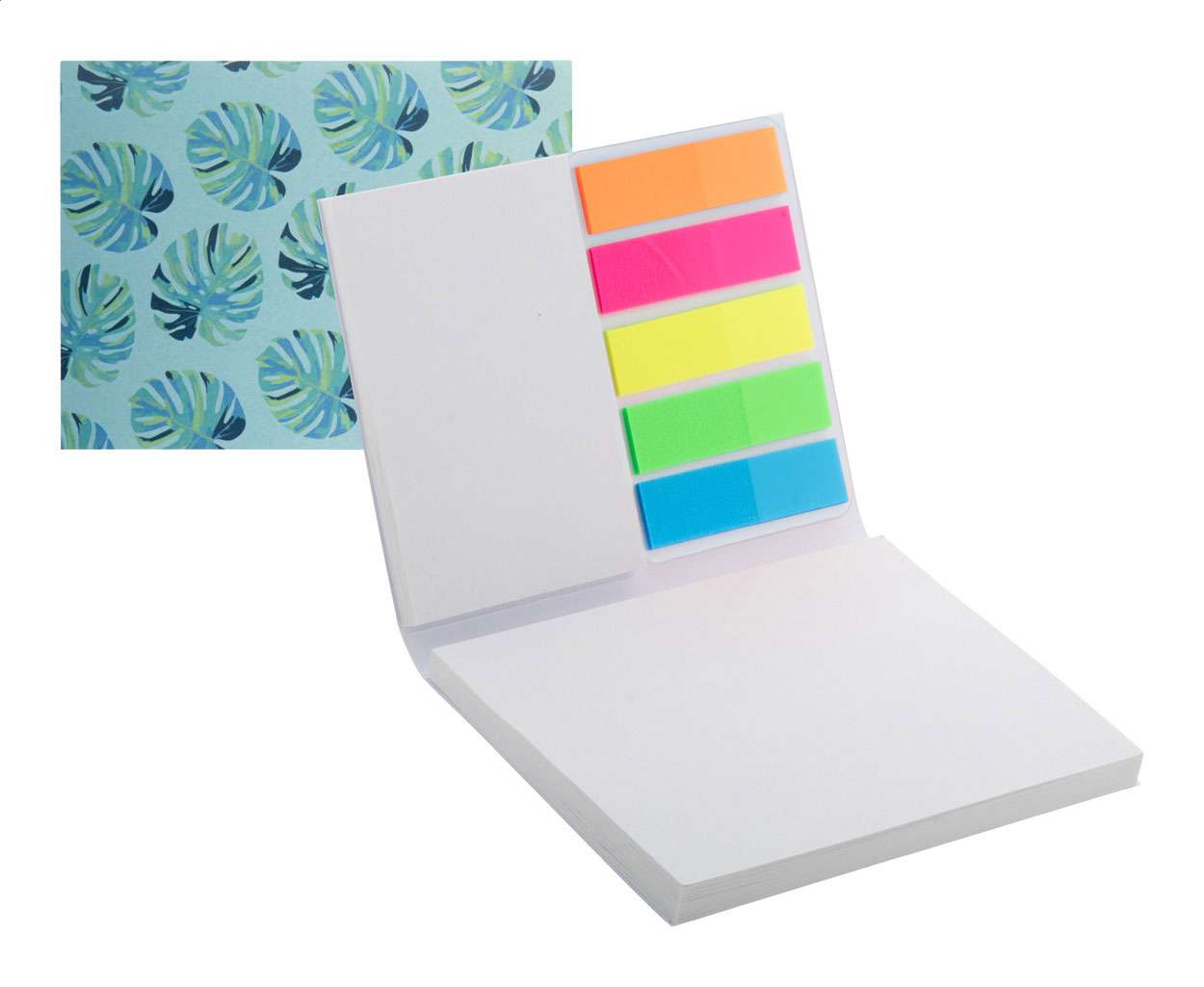 Blocco fogli adesivi e copertina in carta personalizzabile. Comprende foglietti adesivi in carta riciclata in 2 formati (50 fogli da 100x75 mm, 25 fogli da 50x75 mm) e 100 segnapagina in pellicola plastica disponibili in 5 colori assortiti (12x44 mm). Il prezzo include la stampa a colori sull'esterno della copertina. MOQ: 100 pezzi.