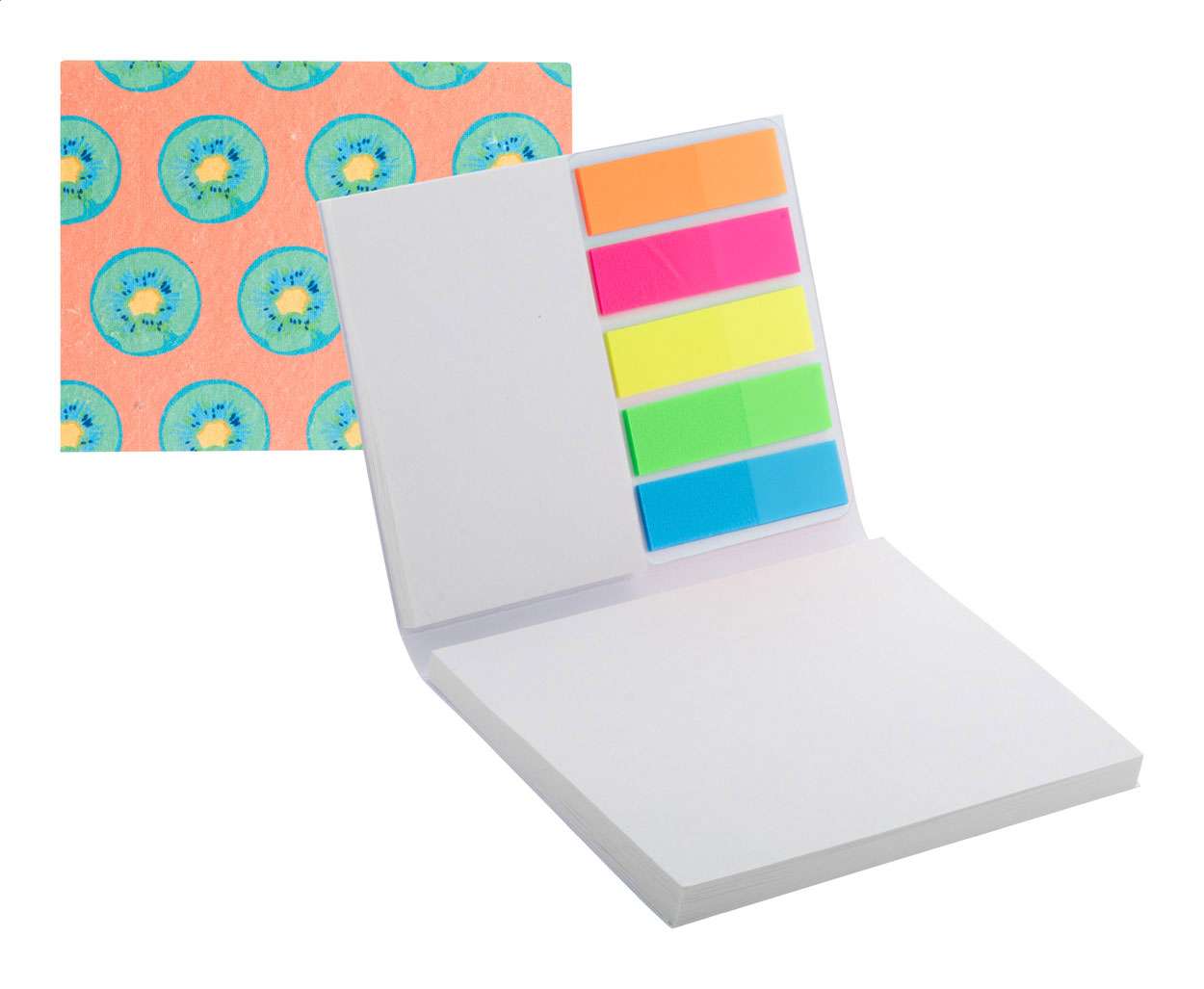 Blocco per appunti personalizzabile, con copertina in carta di semi di fiori selvatici assortiti. Include foglietti adesivi in carta riciclata in 2 formati (50 fogli da 100×75 mm, 25 fogli da 50×75 mm) e 100 segnapagina in film plastico in 5 colori assortiti (12×44 mm). Il costo comprende la stampa a colori della copertina esterna. MOQ: 100 pezzi.