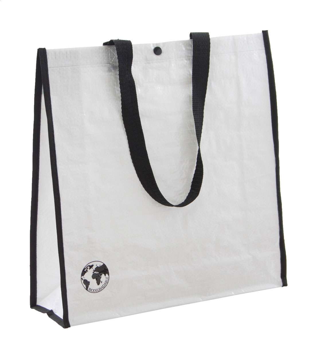 Borsa della spesa in PP 120 g/m² biodegradabile con chiusura a pressione.