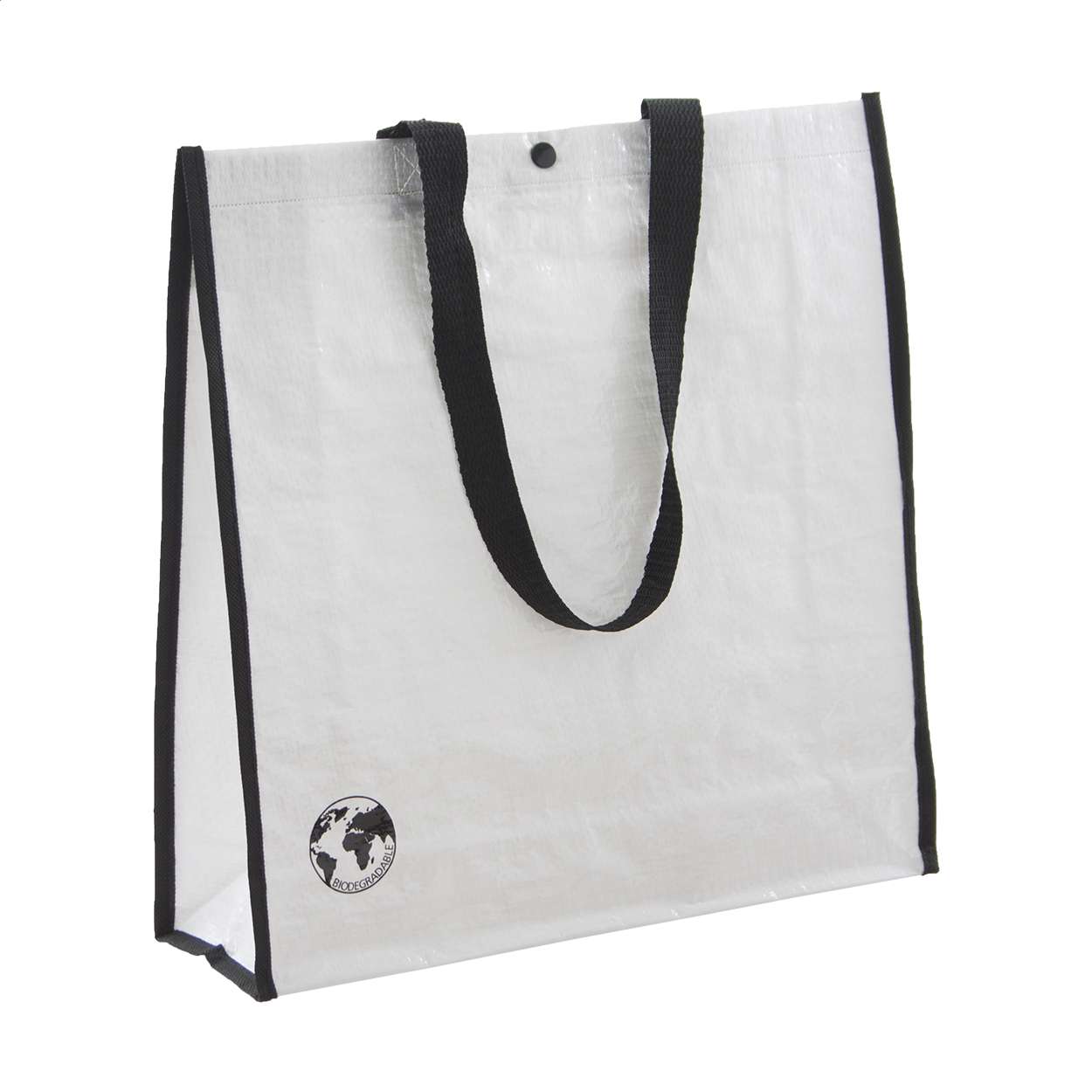 Shopper in PP 120 g/m² biodegradabile con chiusura a pressione.