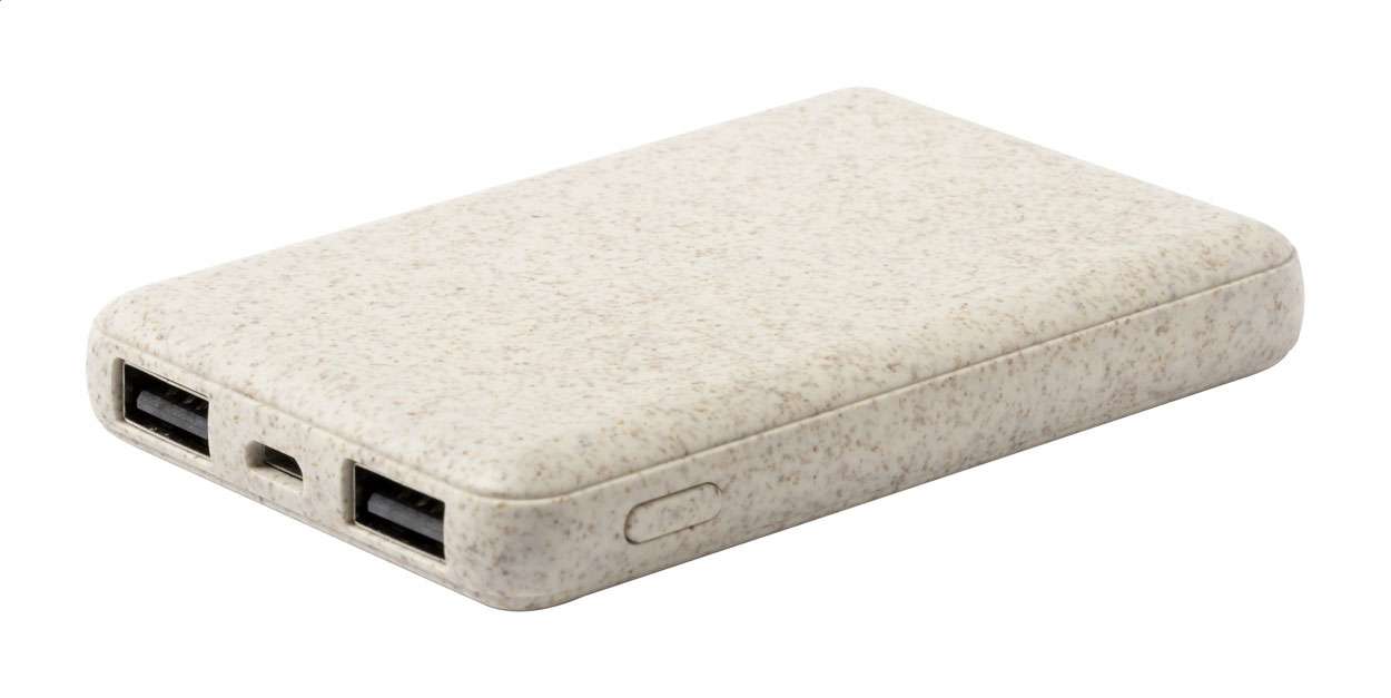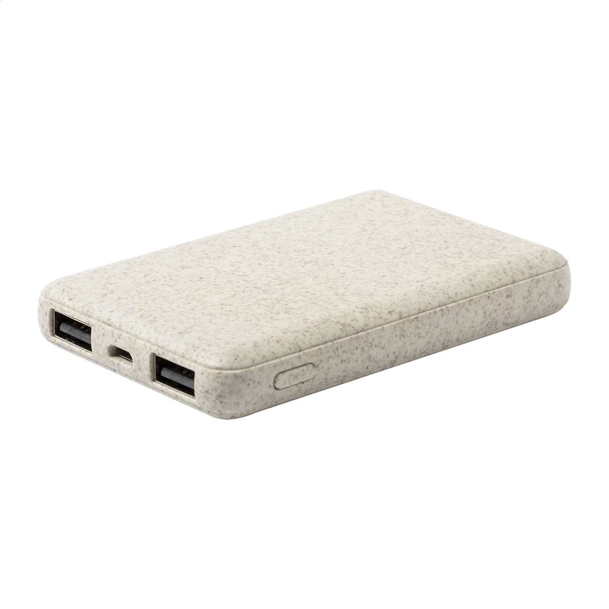 Power bank, corpo in plastica ecologica di paglia di grano con batteria 5000 mAh e 2 uscite USB. Cavo di ricarica micro USB incluso.