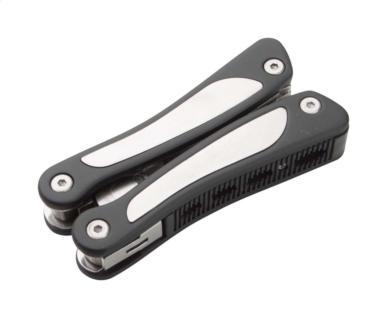 Pinza multiuso in acciaio 9 funzioni: pinze, lima per unghie, 3 cacciaviti, 2 coltelli, apriscatole con custodia in poliestere.