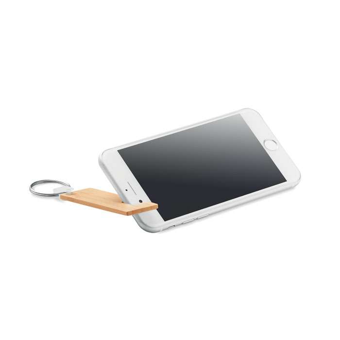 Portachiavi in bamboo con funzione di portacellulare. Un elegante portachiavi in bamboo che funge anche da supporto per il telefono, pratico e utile da portare sempre con sè. Il bamboo è un materiale naturale e può avere delle variazioni leggere di colore, dimensione e stampa. FSC®-certified | FSC 100%, N5.7, FSC-C213206