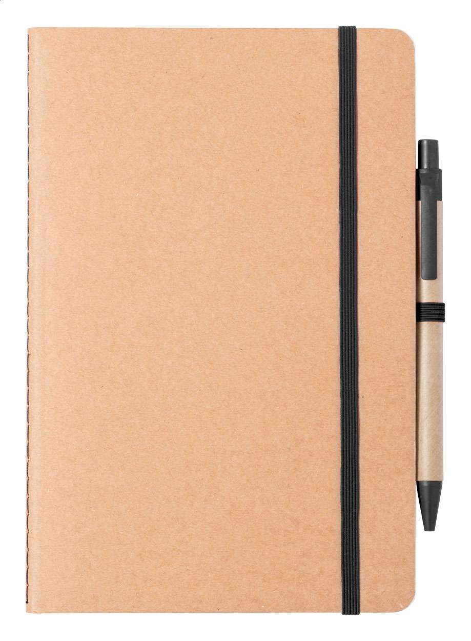 Quaderno ricoperto di cartone riciclato con 60 fogli bianchi e cinturino in gomma colorata, formato A5. Compresa una penna a sfera in plastica di paglia di grano con refill blu.