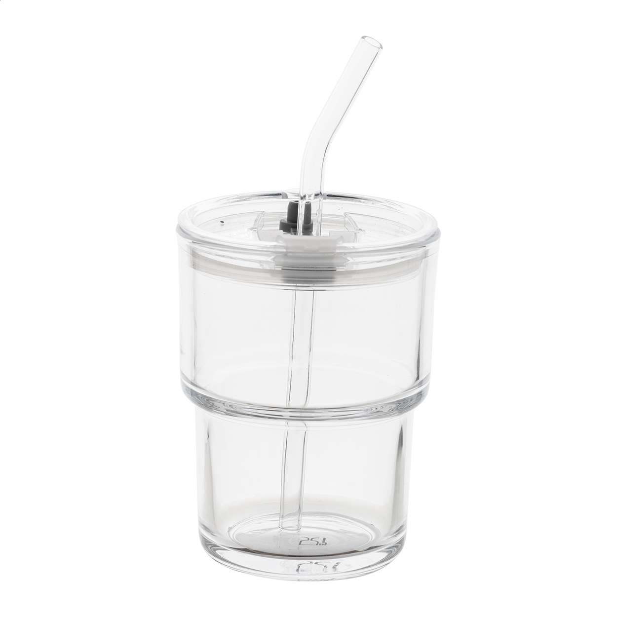 Bicchiere da viaggio in vetro da 400ml. con coperchio in plastica e cannuccia in vetro.
