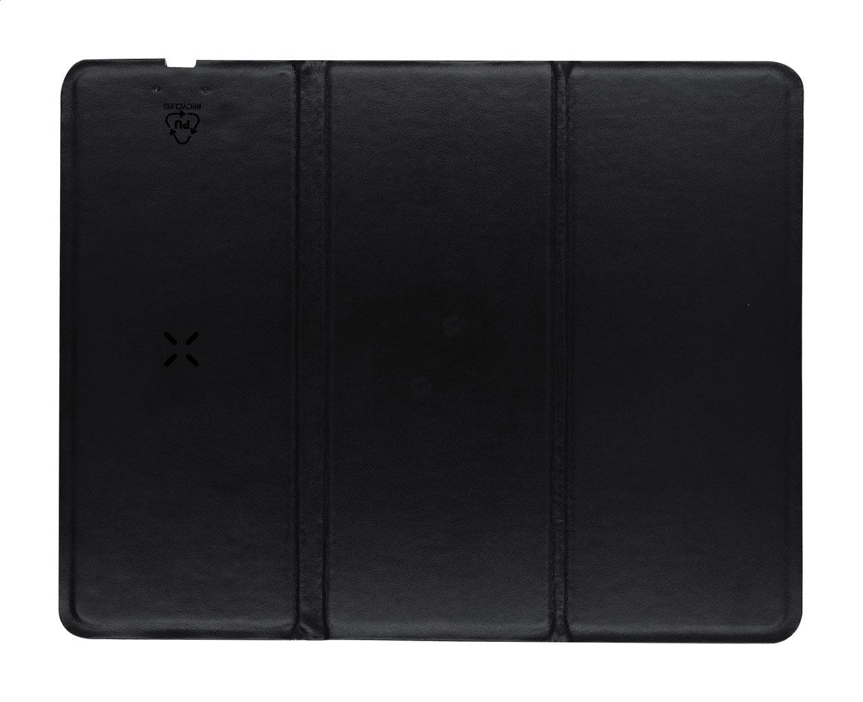 Tappetino per mouse ripiegabile in pelle PU riciclata con caricatore wireless integrato (10W) e funzione portacellulare. Con base antiscivolo in velluto e cavo di ricarica USB incluso.