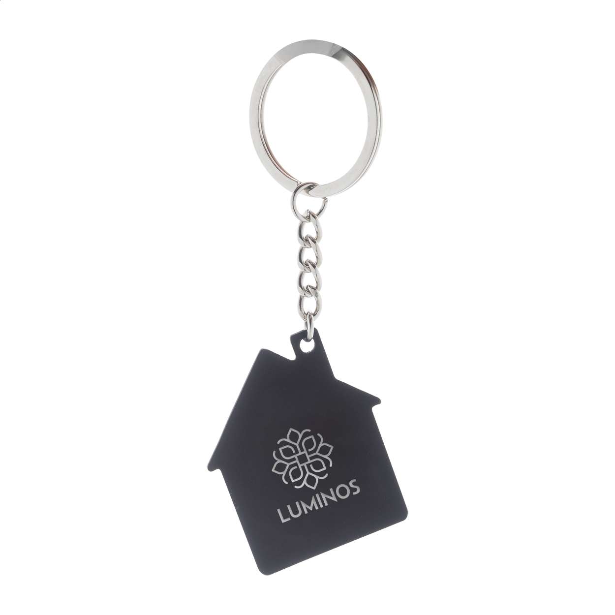 Portachiavi in acciaio riciclato a forma di casa con finitura gommata. Trattamento speciale che permette l'incisione laser a specchio.
