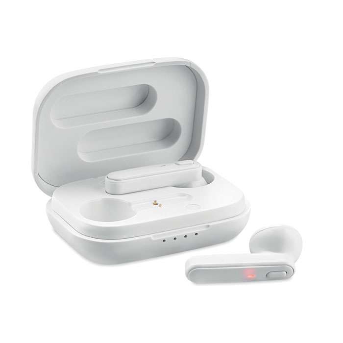 Set di 2 auricolari True Wireless Stereo (TWS) 5.3 con microfono e batteria da 30 mAh integrata. Durata di riproduzione di circa 3 ore. Associazione automatica. Include un cavo di ricarica micro USB e una stazione di ricarica da 185 mAh. Realizzato in ABS riciclato.