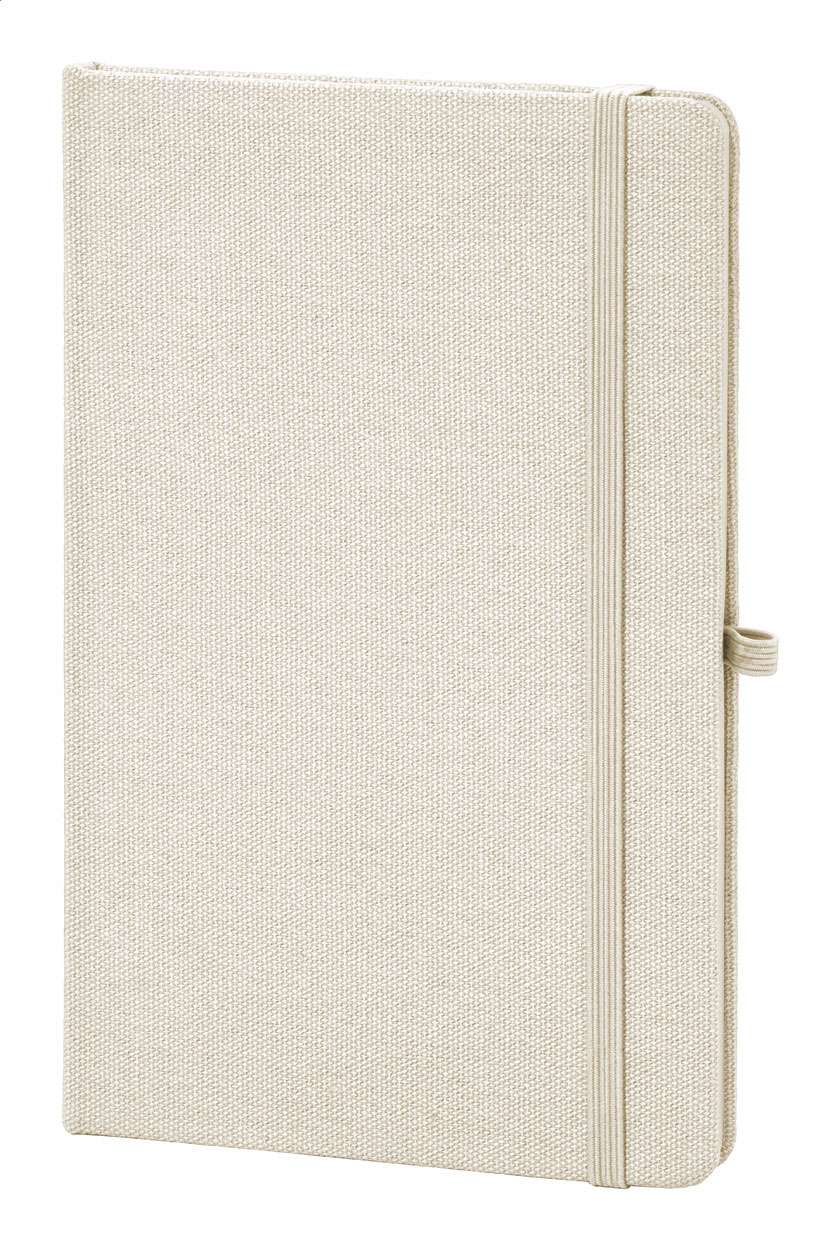 Quaderno con copertina in cotone riciclato da 80 fogli in carta riciclata a righe. Segnalibro in colore coordinato, elastico e portapenne. Formato A5.
