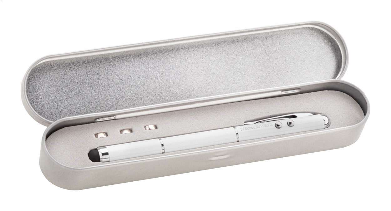 Puntatore laser multifunzione con penna a sfera capacitiva e luce LED. Completo di elegante astuccio regalo in metallo con batterie a bottone e refill blu.