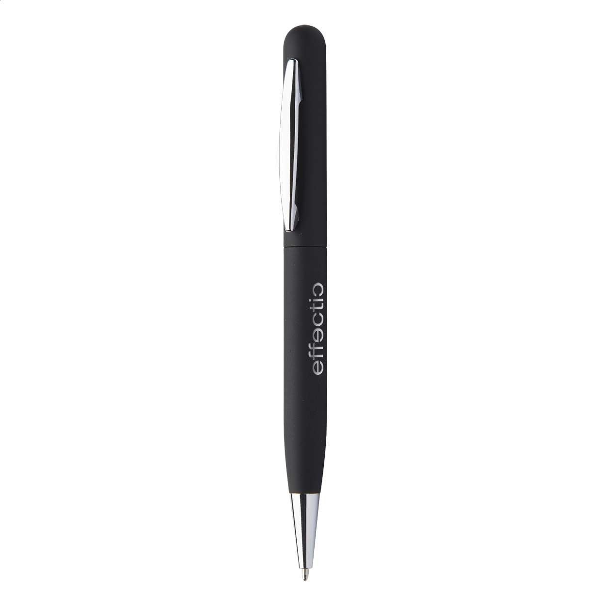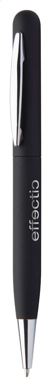 Penna a sfera in metallo con meccanismo a rotazione, finitura gommata e refill blu. Rivestimento speciale per incisione laser a specchio.