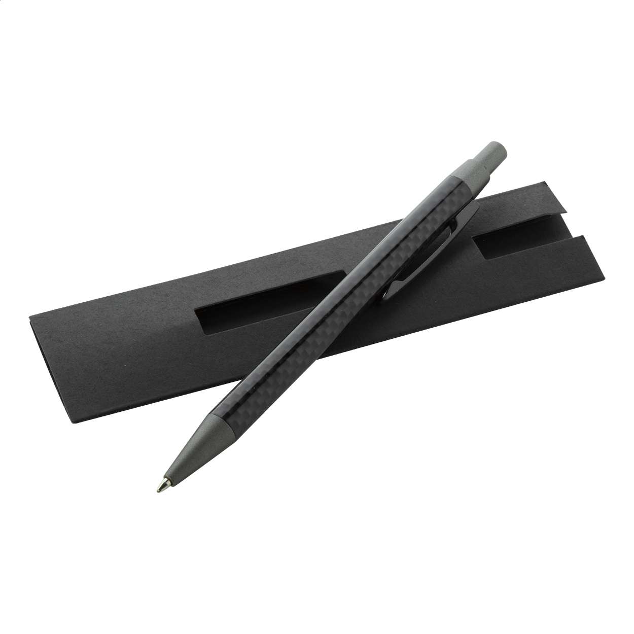 Penna a sfera in metallo e corpo con decorazione simil carbonio, in custodia di cartoncino nero. Con refill blu.