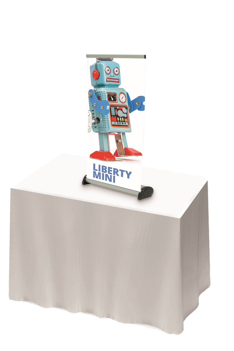 Liberty Mini è un banner versatile adatto sia per l’uso da tavolo che da pavimento. Questo banner è un prodotto attraente ed elegante e ideale per la comunicazione quando lo spazio è ridotto. Kit di estensione dell’asta ad altezza 1200mm oppure 1600mm su richiesta (cod. EP-MINI) Profilo superiore a scatto Terminali in color grigio scuro Ultra compatto