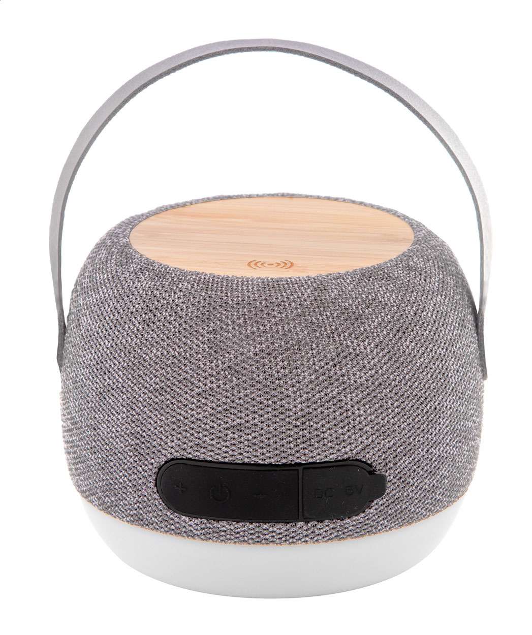 Altoparlante wireless con alloggiamento in ABS riciclato rivestito in tessuto RPET, luce LED nella parte inferiore e caricatore rapido wireless (15W) con piastra in bambù nella parte superiore. Con tracolla in pelle PU, funzione di chiamata in vivavoce e batteria ricaricabile integrata (1200 mAh). Cavo di ricarica USB incluso.