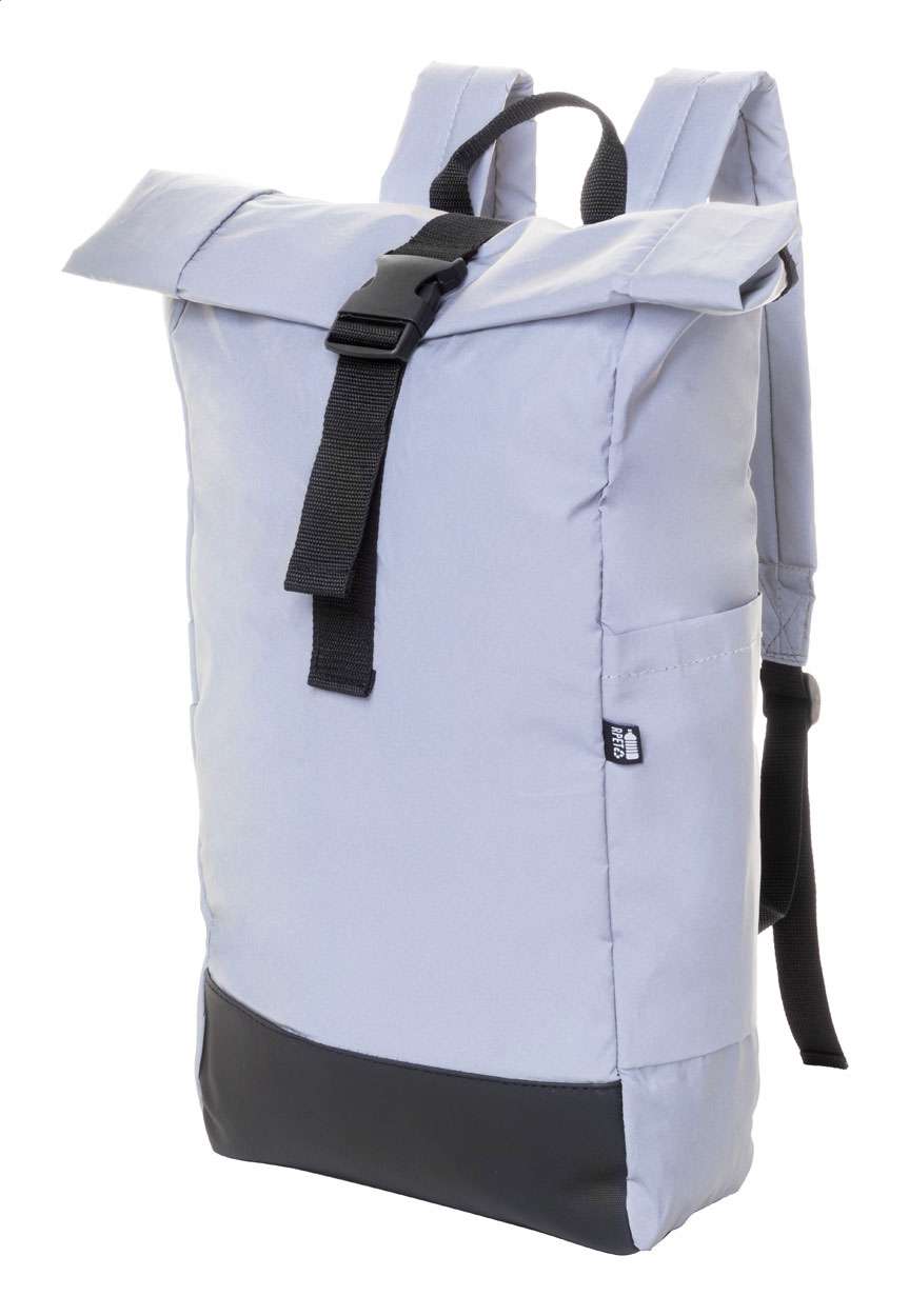 Zaino rolltop rifrangente in poliestere RPET con scomparto principale chiuso da fibbia, tasca nascosta chiusa da cerniera, scomparto imbottito per laptop (15"), tasca laterale, schienale e spallacci imbottiti. Etichetta RPET. Solo ad uso promozionale, il prodotto non può essere considerato un dispositivo di protezione personale.