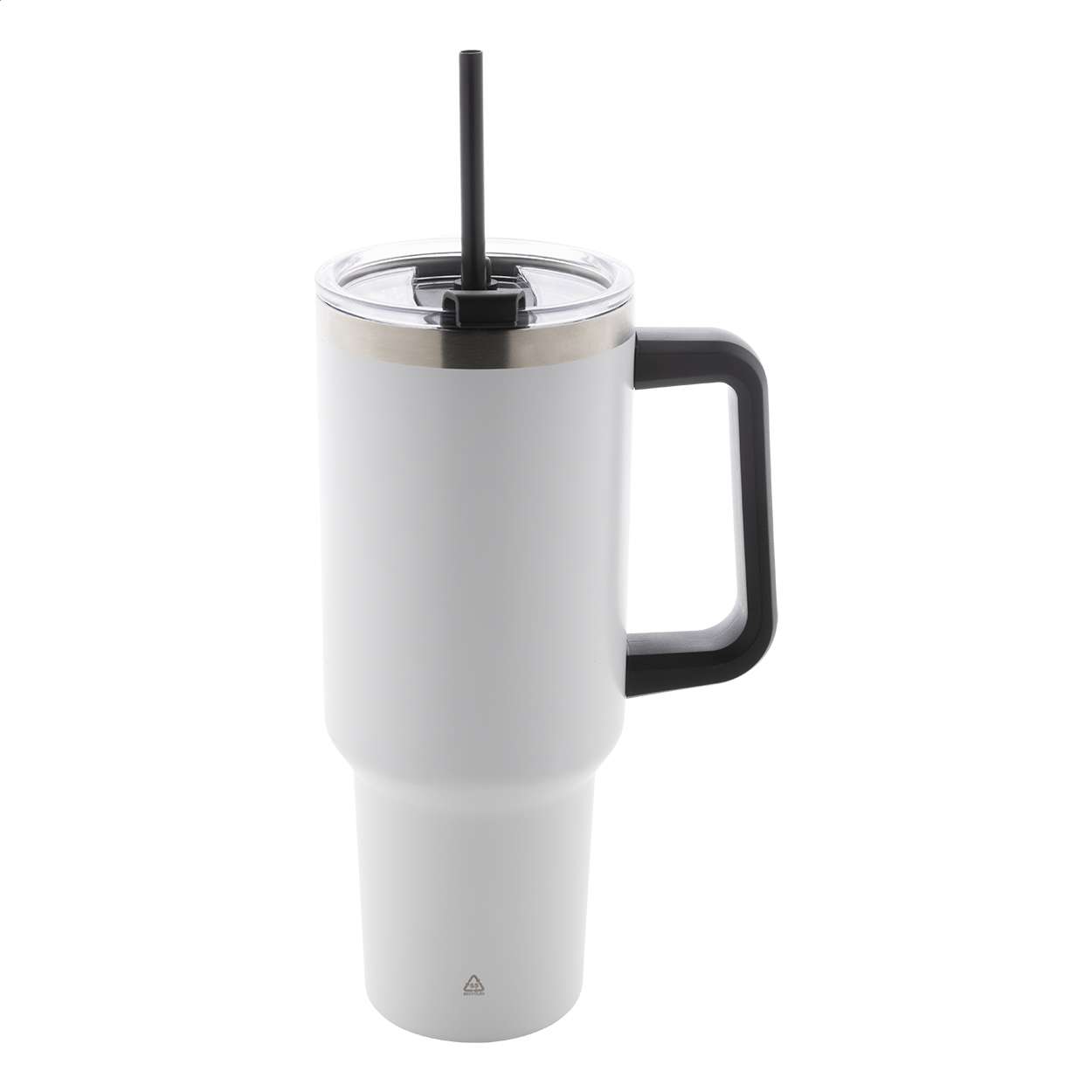 Tazza mug termica da 1200 ml. in acciaio riciclato a doppia parete, con coperchio in PS e cannuccia in PP.