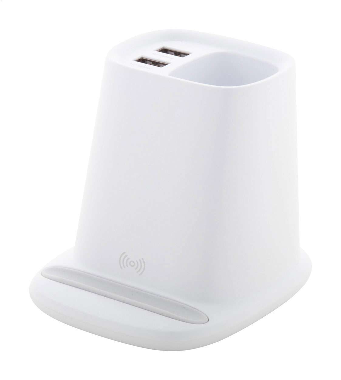 Portapenne multifunzione da scrivania in plastica con supporto per il telefono, caricatore rapido wireless integrato (10W) e 2 porte di ricarica USB (uscita massima 2000 mA). Cavo di ricarica USB incluso.