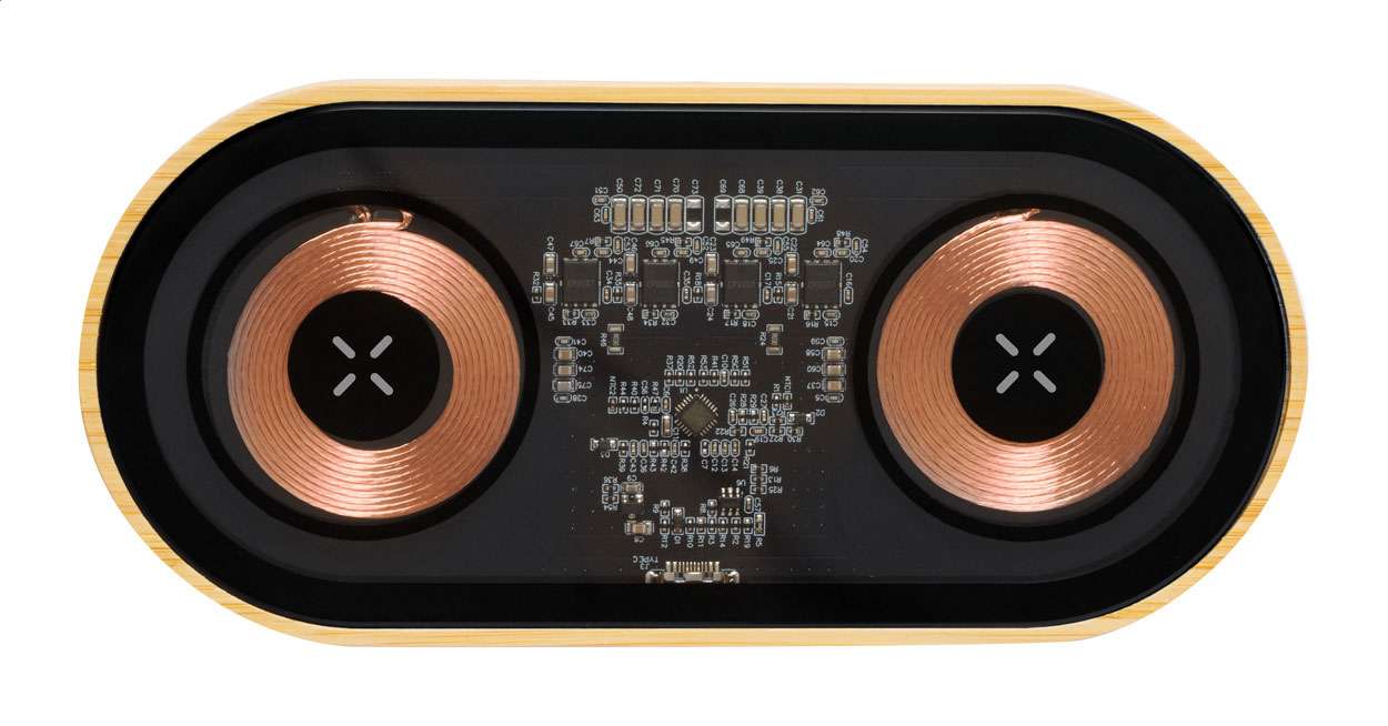 Caricatore rapido wireless a doppia bobina (15W) con struttura in bambù e plastica trasparente, componenti elettronici a vista. Cavo di ricarica USB incluso.