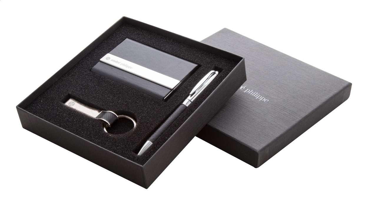 Set composto da portabiglietti da visita, portachiavi e penna a sfera con finitura in PU, in confezione regalo. Materiale: similpelle e metallo. Prodotto a marchio André Philippe.