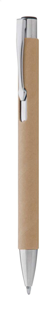 Penna a sfera in carta riciclata con parti in metallo e refill blu.