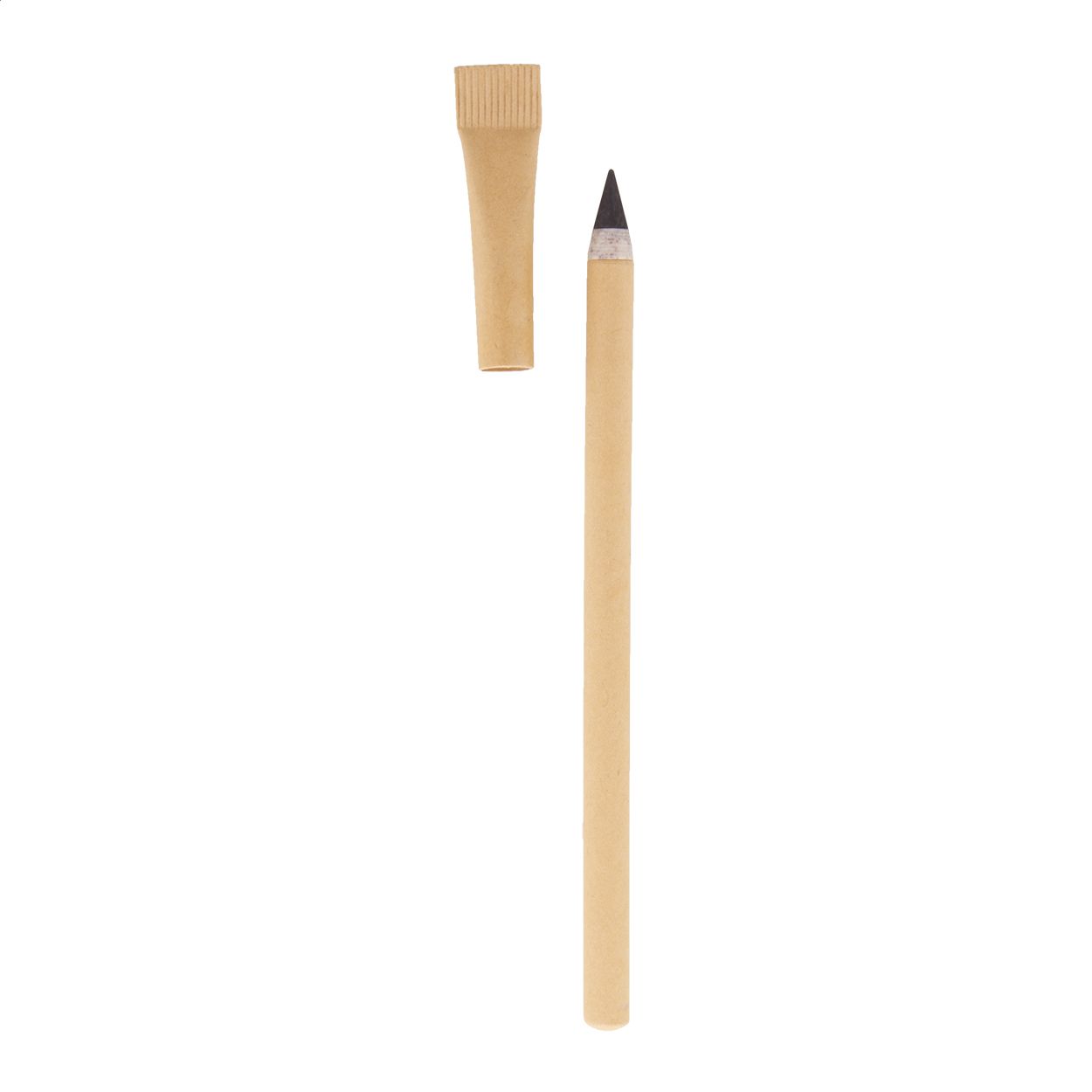 Penna senza inchiostro a lunga durata in carta riciclata, cappuccio in colore coordinato, parti in plastica di paglia di grano e punta in lega metallica che ossida la carta. Questa penna scrive come una matita ed è anche cancellabile.
